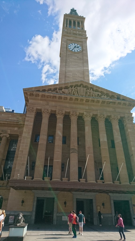 Nous espérions pouvoir visiter ensuite la Clock Tower, située dans l’iconique Brisbane City Hall, mais nous arrivons trop tard, les visites sont complètes… Nous nous contenterons donc de l’admirer depuis l’extérieur, d’explorer les ruelles (et les magasins) alentours, avant de reprendre le chemin de notre hôtel.
