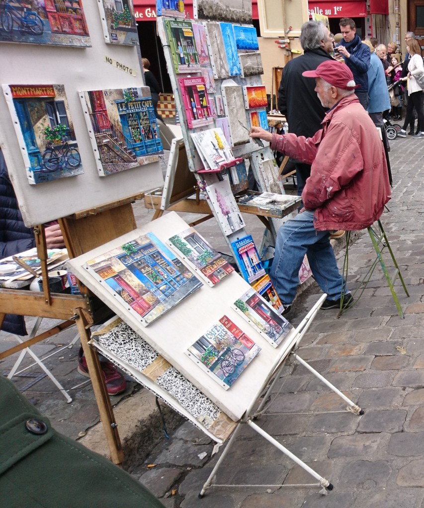 A deux pas de la basilique se trouve la fameuse place du Tertre. J’aime l’ambiance particulière de cette place, malgré les nombreux touristes qui s’y pressent. Et puis c’est l’occasion pour les enfants de découvrir des peintres à l’œuvre et observer des toiles dans un cadre bien différent de celui d’une galerie (même si, ok, on est loin des grands maitres). Le gnome les regarde travailler totalement fasciné, et j’ai toutes les peines du monde à le déloger quand vient l’heure d’aller manger.