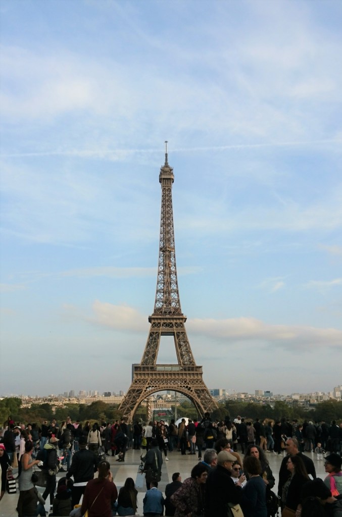 Cette visite commence un peu plus loin, au Trocadero. C’est de loin le meilleur endroit pour admirer la Dame de Fer, que l’on rejoint ensuite à pied depuis là en traversant les jardins. Nous avions pris les billets à l’avance sur le site internet et ce n’est pas la période de l’année où il y a la plus forte affluence. Malgré cela, la file d’attente pour passer le contrôle de sécurité puis monter dans l’ascenseur est bien longue…