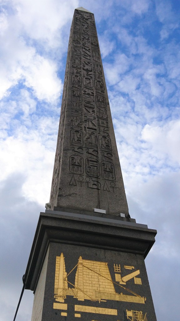 Le gnome a décidé que ce midi ce serait pique-nique; pas question de perdre du temps en allant dans un resto ! Il nous entraine donc d’un pas décidé vers l’entrée du métro, direction la place de la Concorde. Sur la place, nous allons admirer la fameuse obélisque, arrivée à Paris en 1833 en provenance de Louxor. Le gnome, passionné par l’Egypte en ce moment, l’étudie sous toutes ses coutures pour y voir les nombreux hiéroglyphes. Il est vrai qu’elle est impressionnante, même si peu de gens semblent venir la voir.