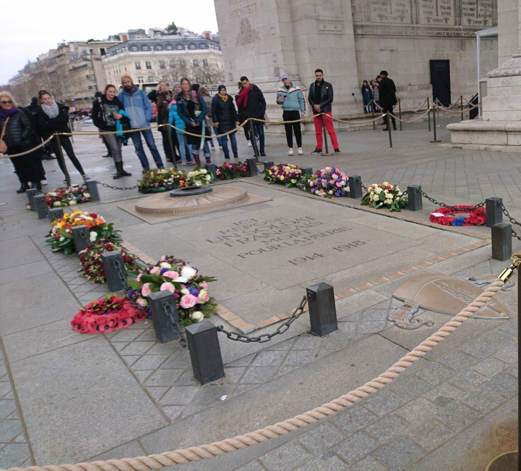 De retour en bas, nous admirons les sculptures ornant l’Arc de Triomphe, les nombreuses inscriptions, et bien sûr la tombe du soldat inconnu.