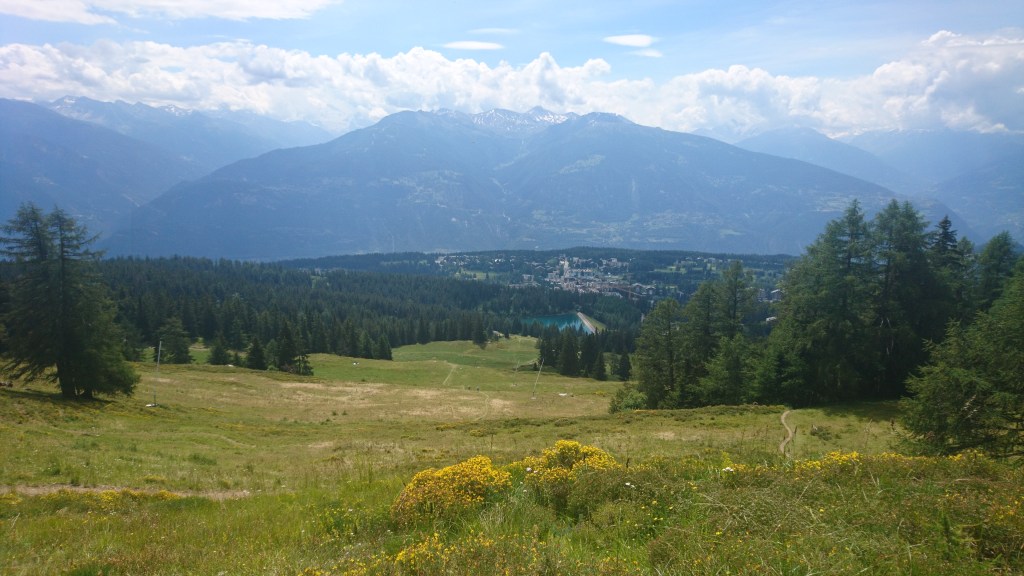 Après un bon repas sur la terrasse ensoleillée, nous reprenons le sentier pour descendre à pieds jusqu’à Crans-Montana. Une demi heure de balade sans difficulté, et nous rejoignons la station près du départ du télécabine.