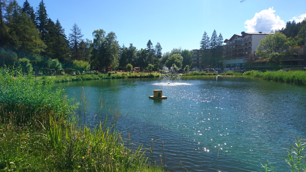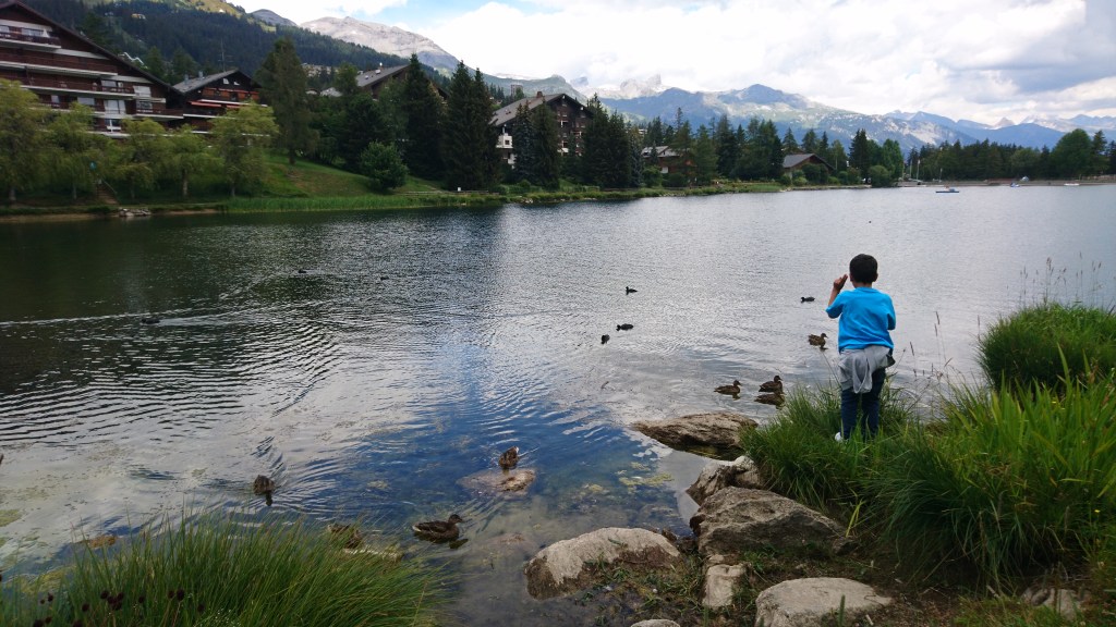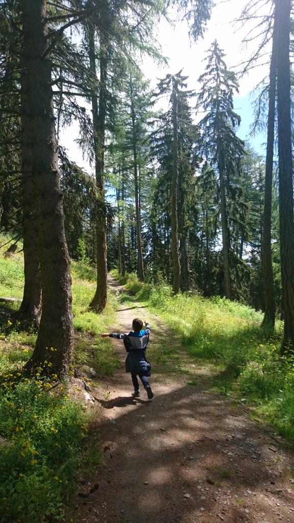 Premier jour, première randonnée ! Et première utilisation de l’Explorer card pour monter en télécabine à Cry d’Er. Nous suivons la route en terre à travers les pâturages jusqu’au Chetseron avant de bifurquer pour prendre le sentier partant en dessous du restaurant. (La terrasse offre une vue magnifique si vous souaitez vous y arrêter.) La balade se poursuit entre prairie et forêt jusqu’à Merbé, le gnome dénichant au passage des petites fraises des bois. Puis nous descendons pour rejoindre le lac de Chermignon. C’est l’endroit idéal pour une pause pique-nique ! Des tables à l’ombre des arbres qui bordent le lac, des grills à disposition, des WC, et un terrain de jeu idéal pour les enfants : la forêt.