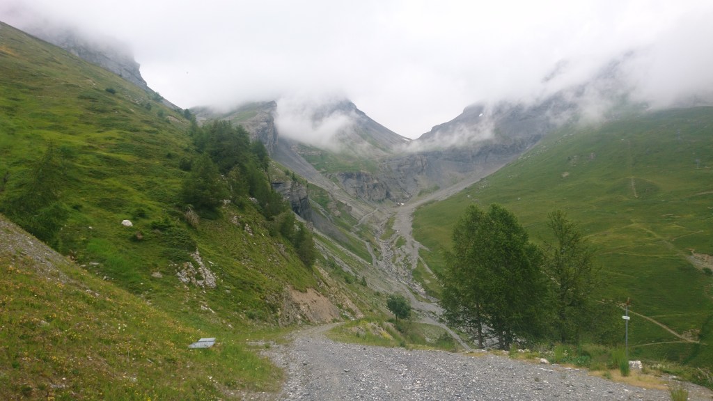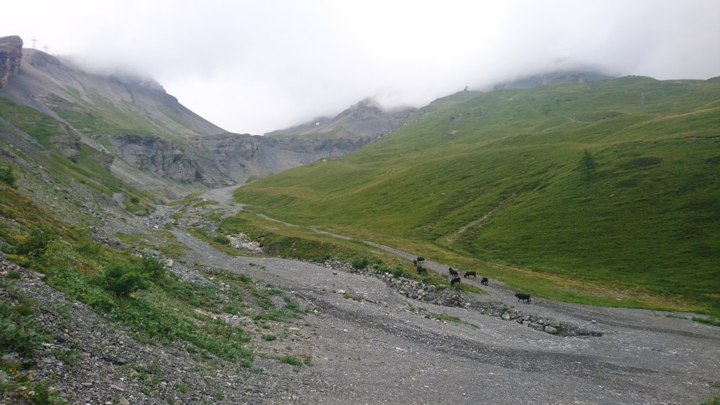 Nous descendons en suivant la direction de Plumachit, rejoignant tout d’abord La Sinièse. Quand j’étais enfant, je me rappelle qu’il s’agissait d’un véritable torrent au bord duquel nous aimions pique-niquer et d’où on apercevait le glacier de la plaine morte. Aujourd’hui ce n’est plus qu’un mince filet d’eau au bord du quel quelques vaches tentent désespérément de s’abreuver et nous ne voyons que deux névés, toutes petites taches blanches tout là haut. Je n’étais plus revenue à cet endroit depuis une vingtaine d’années et le contraste… C’est un choc de découvrir le changement. Je regrette que le gnome ne puisse pas voir cet endroit tel qu’il était avant. Vive le réchauffement climatique…