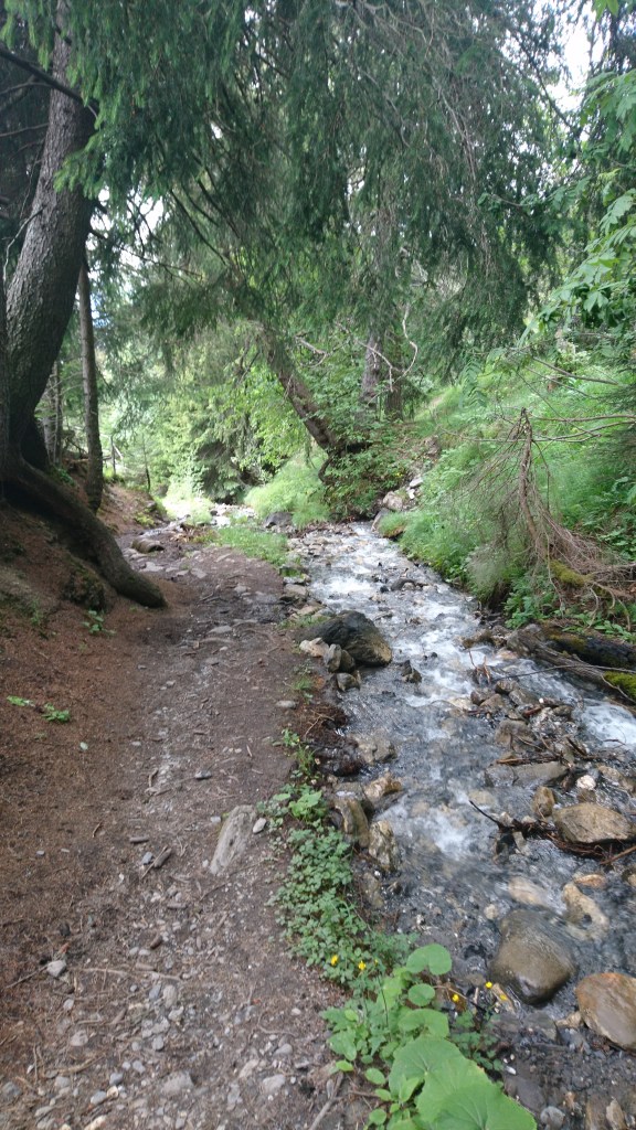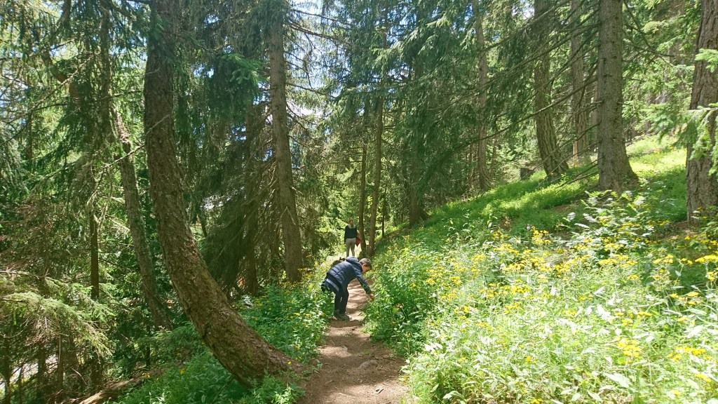 Mais aujourd’hui, nous ne nous y attardons pas et nous prenons le sentier sillonnant presque à plat entre forêt et pâturages en direction de Vermala. En principe il faut à peine 30 minutes pour atteindre Vermala, mais nous flânons, prenant le temps d’observer la nature qui nous entoure, de découvrir les nombreuses fleurs de montagne et de cueillir des fraises des bois et des framboises sauvages.