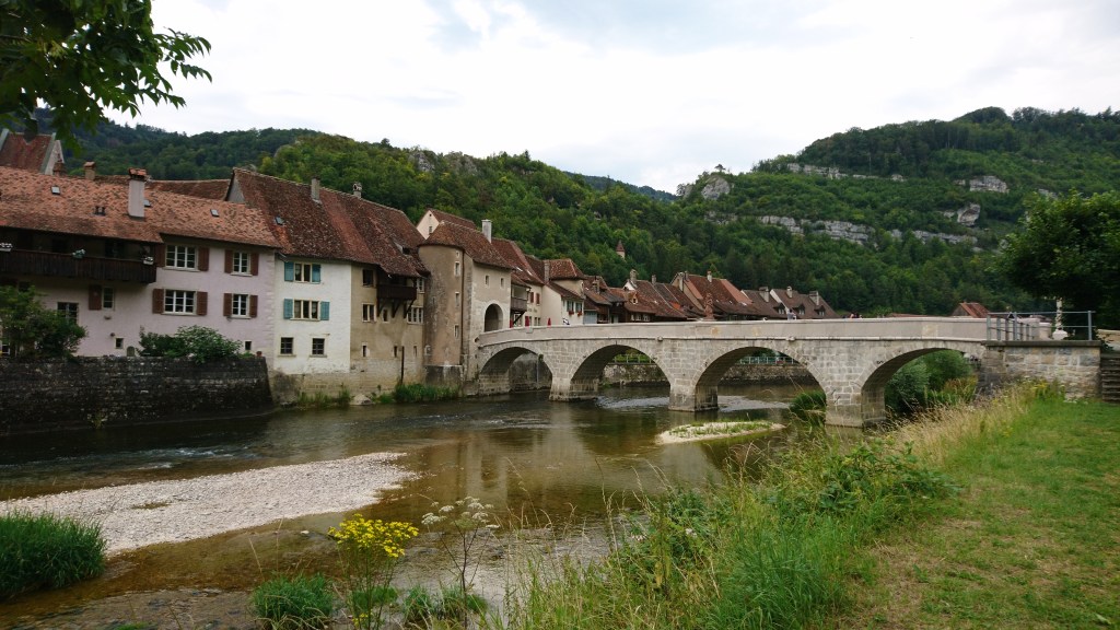 Avant de rejoindre Saignelégier où nous passerons la nuit, nous retournons à Saint-Ursanne pour une baignade dans le Doubs à la demande du gnome.