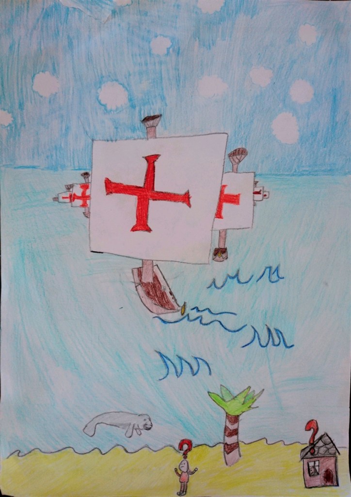 Un jour, des étrangers arrivèrent par la mer. C’étaient les conquistadors espagnols qui, avec leurs grands navires, venaient envahir l’île. Après avoir tenté de se battre, la tribu maya dû s’enfuir devant les envahisseurs étrangers qui étaient plus forts qu’eux car ils possédaient des armes à feu.