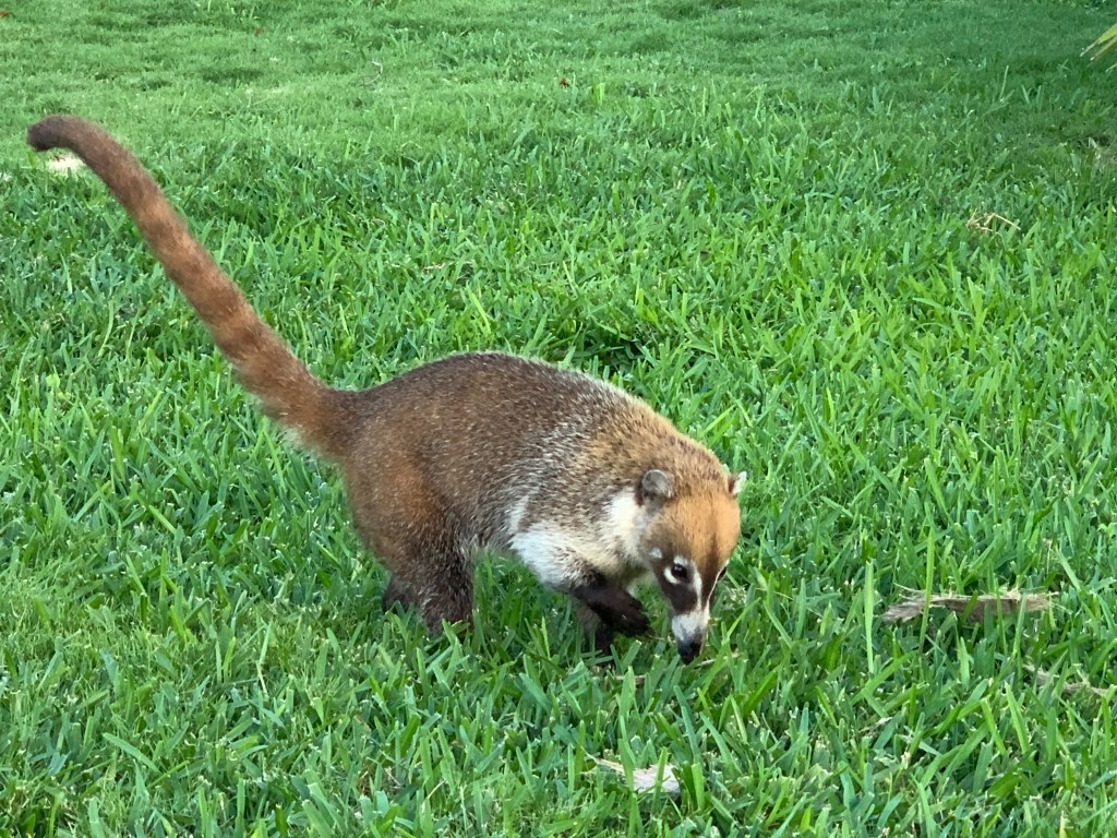 Description : Le coati est un petit animal roux et mignon. Il a un long museau et une très longue queue. Il n’est pas dangereux mais il peut venir voler de la nourriture. Il se déplace en groupe.
