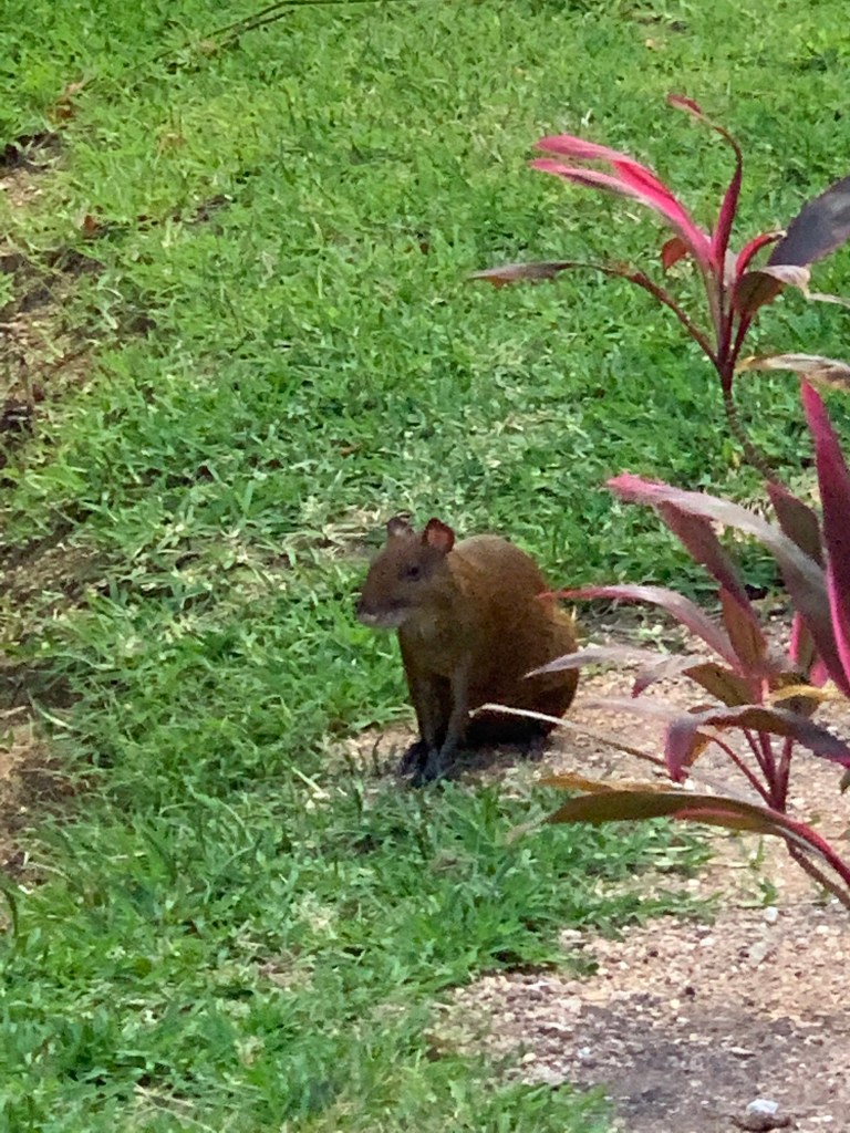 Description : L’agouti est un rongeur. Il est brun orangé. Il est très mignon mais très peureux. Dès qu’on l’approche, il s’enfuit pour se cacher dans les buissons. Il est solitaire.