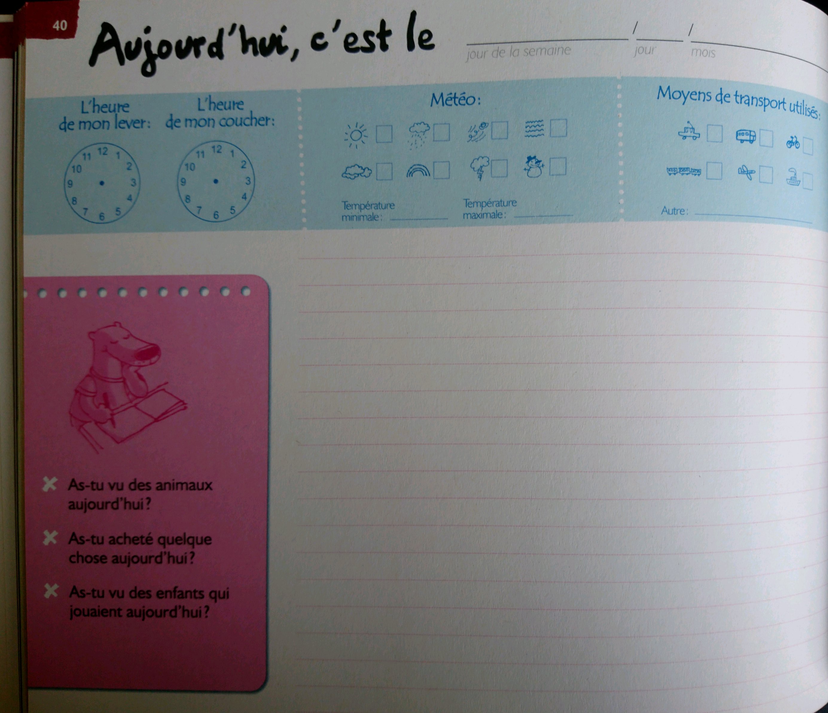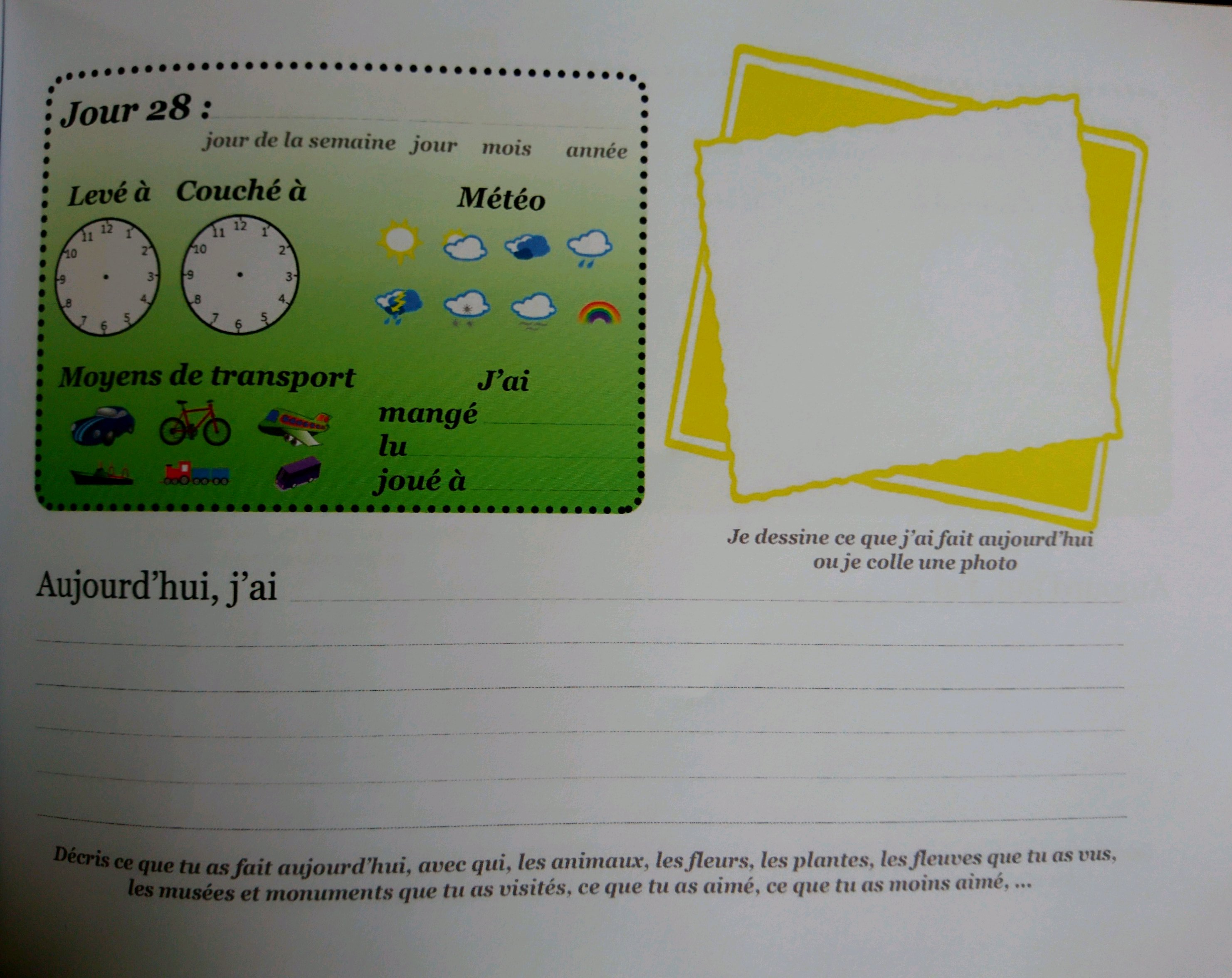 Il peut commencer déjà à remplir la ou les premières pages avec les préparatifs : On part où ? Avec quel mode de transport ? On prend quoi dans la valise ? Qu’est ce qu’il se réjouit de voir durant le voyage ?