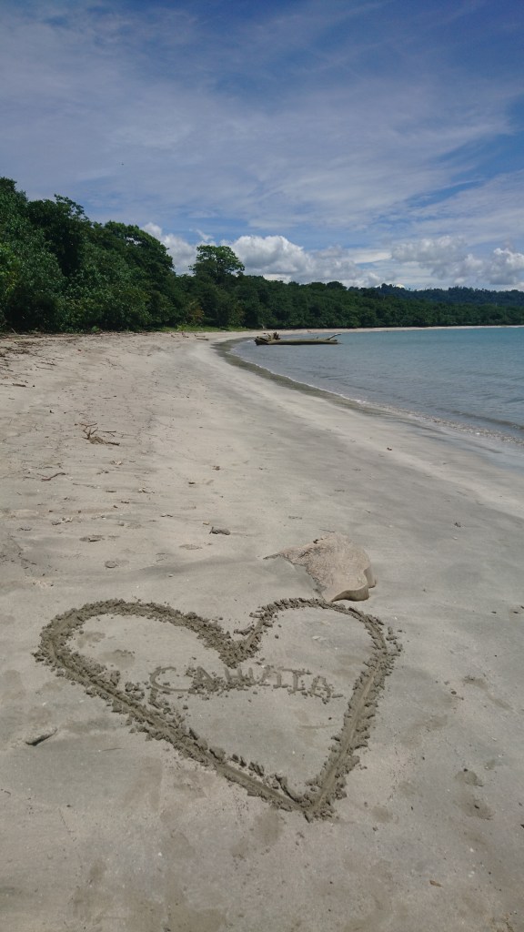 C’est la plage principale de Cahuita, qui comme son nom l’indique, est une plage de sable noire. Ayant déjà fait l’expérience ailleurs de plages de cette couleur, je craignais un peu que le sable ne soit brûlant sous nos pieds. Mais non, le sable fin reste en permanence légèrement humide sur toute la largeur de la plage, gardant une certaine fraîcheur, et est parfait pour faire des châteaux de sable et autres constructions.