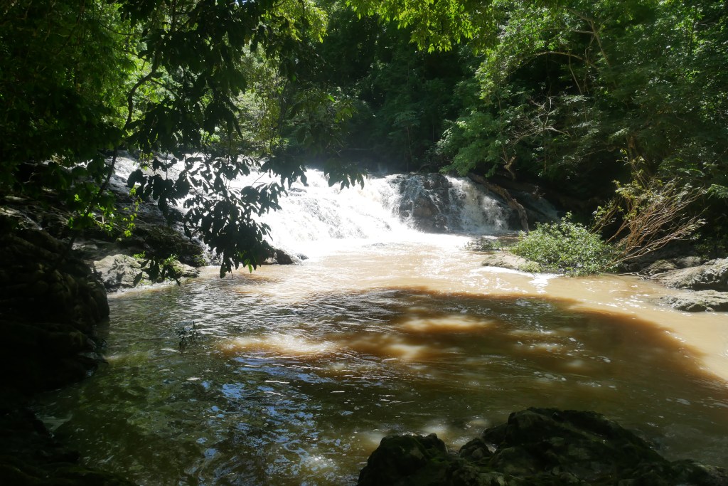 Après ce bon petit déjeuner, nous avons prévu aujourd’hui d’aller découvrir les cascades de Montezuma. Ayant lu qu’il s’agissait d’une marche facile, même avec des enfants, nous tentons tout d’abord de passer par le bas de la rivière et nous nous rendons donc à pied jusqu’au début du « sentier », à 10 minutes du cœur du village. Il faut tout d’abord grimper quelques mètres sur un passage rocailleux le long de la rivière, après quoi je m’aperçois qu’il faut traverser la rivière, pas à gué mais en passant dans l’eau. Il y a quand même une certaine profondeur, des rochers sous l’eau boueuse dont nous ne distinguons rien, du courant, et le chemin de l’autre côté semble également compliqué. Je ne sais pas si c’est vraiment plus facile en pleine saison sèche qu’en juin, mais là ça me semble trop risqué avec le gnome et je décide donc d’abandonner.