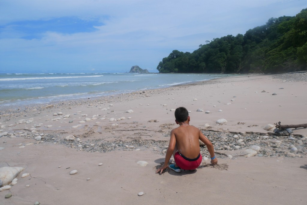 La réserve est magnifique et sur notre chemin nous croisons des singes, des biches, différents oiseaux et des crabes halloween. Certains passages sont un peu compliqués pour les petites jambes, avec des marches hautes, mais enfin voilà au bout du chemin la récompense : la plage de Cabo Blanco.