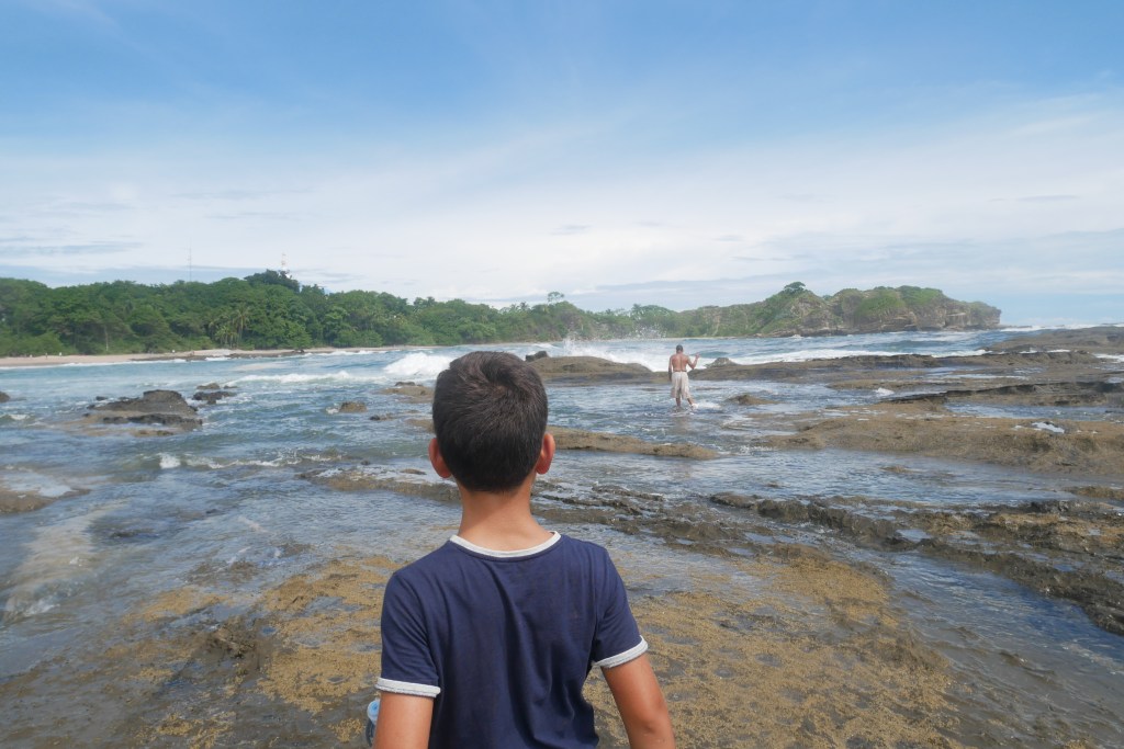 Quand enfin il accepte d’abandonner son geyser, nous poursuivons jusqu’à la Playa Guiones, juste à côté. Ici il y a bien plus de monde, mais ce n’est pas la place qui manque. La plage s’étire à perte de vue. Les vagues, bien que grosses, y sont tout de même un peu moins violentes et nous en profitons donc pour aller nous baigner avant que le gnome ne parte à la chasse aux crabes et autres petits animaux dans les petits bassins d’eau apparaissant sur la plage à marée basse.