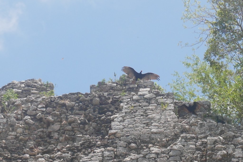 Il y a 4 groupes de bâtiments, dont le plus impressionnant et le plus connu, la pyramide de Nohoch Mul. Le premier groupe que nous découvrons, le plus proche de l’entrée, est le « grupo Coba » où se trouve un premier jeu de balle ainsi que le temple appelé « l’Eglise ». C’est la 2ème plus grande structure de Cobá et à son sommet trône un couple de vautours.