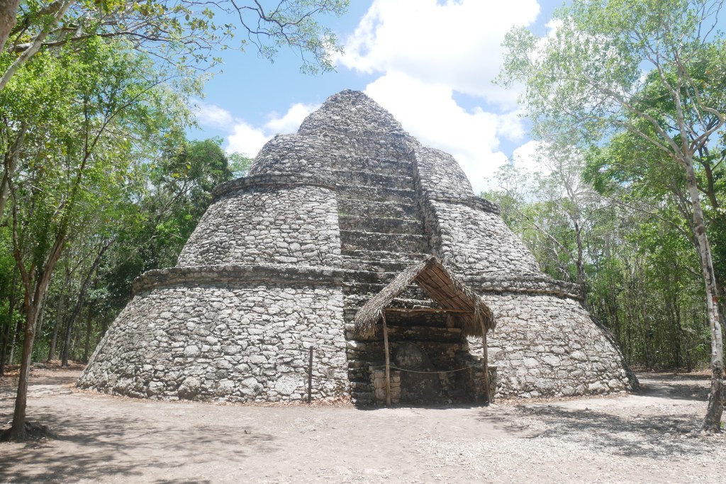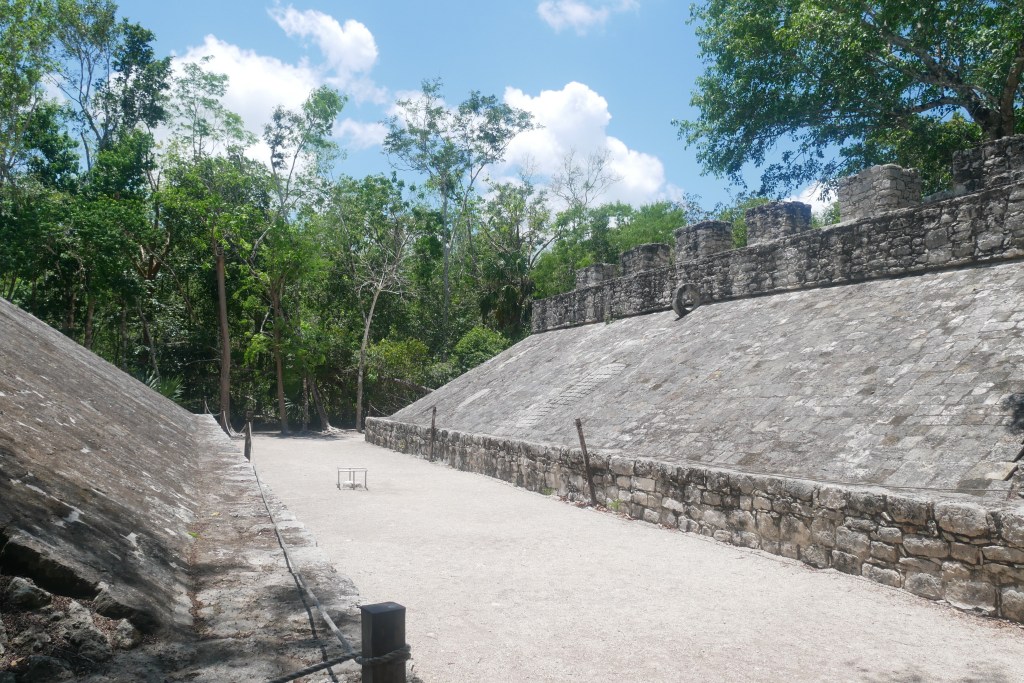Plus loin, nous atteignons le « grupo D » et son grand jeu de balle, le second sur le site archéologique de Cobá. On peut encore y voir les anneaux à travers lesquels les deux équipes devaient envoyer le ballon ainsi que de très beaux reliefs. L’Observatoire, ou Xaibe, est lui aussi plutôt bien conservé et surprenant de par sa forme arrondie.