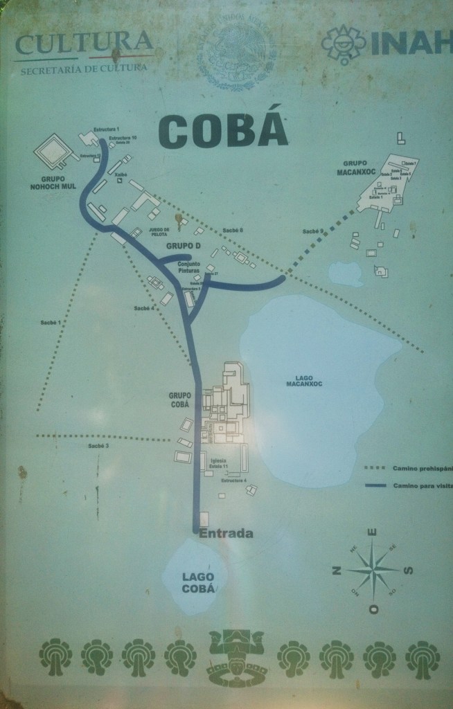 A notre arrivée, plusieurs guides sont postés vers l’entrée, y compris des guides francophones qui nous proposent une visite guidée du site archéologique de Cobá. Mais comme nous avions déjà fait une visite guidée à Chichen Itza lors de notre précédent séjour au Mexique, apprenant au passage quantité de choses sur la civilisation maya, et que j’avais déjà un peu potassé l’histoire de Coba et de ses bâtiments, c’est seuls que nous partons à la découverte des lieux.