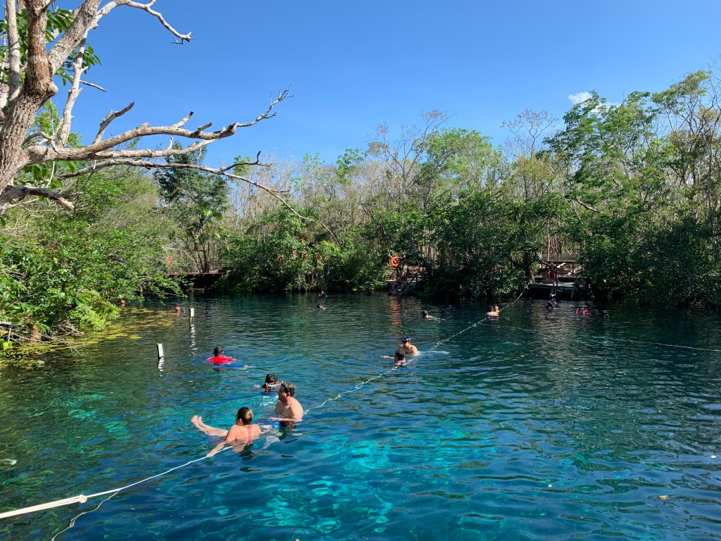 Après la visite du site archéologique de Cobá, vu la chaleur, une baignade s’impose. Il y a plusieurs cenotes à proximité directe de Coba mais je préfère faire un petit bout de route et m’arrêter à Aktun Ha o Car Wash à une vingtaine de minutes de là, sur notre trajet du retour. C’est un joli cenote ouvert, assez grand, où il n’y a pas de trop de monde. Et puis surtout, on y trouve une plate-forme d’où sauter et plonger dans l’eau, pour le plus grand plaisir des enfants !