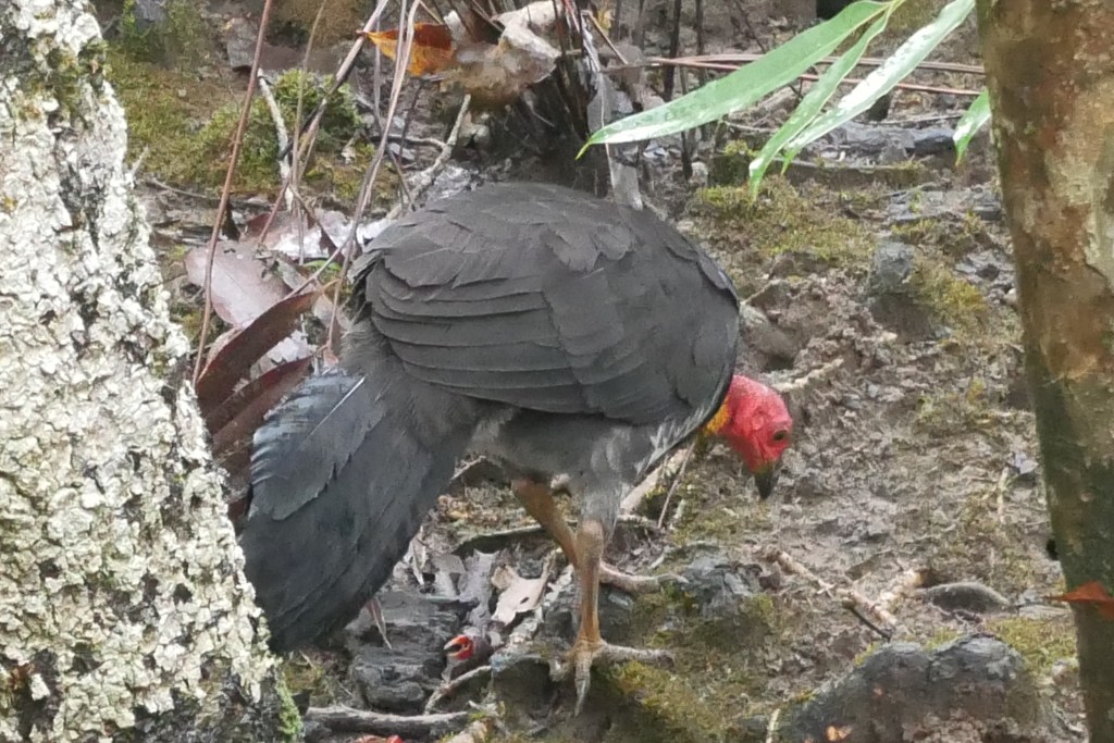 Sur la route peu plus loin, on tombe sur une voiture arrêtée sur le bas-côté. Quelques mètres plus loin, deux personnes semblent regarder en direction de la forêt… Il doit y avoir un casoar ! Hop, on s’arrête donc, et effectivement, nous découvrons un papa casoar avec son petit en contrebas juste en bordure de la route ! (Chez les casoars, ce sont les mâles qui s’occupent des enfants.)