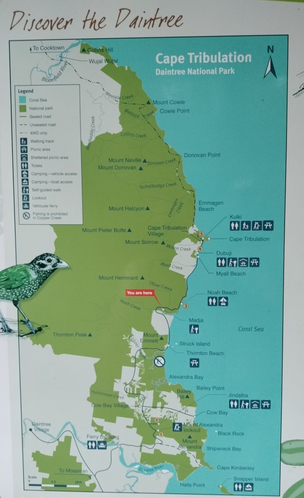 Nous voilà arrivés à Cap Tribulation ! Je m’attendais à voir un petit village, mais ce n’est pas du tout le cas. Il y a quelques maisons à priori éparpillées dans la forêt, invisibles et éloignées les unes des autres. Et comme “centre du village”, une épicerie, un resto – camping, un café – hôtel – agence d’excursion tout en un (Ocean Safari), une mini aire de jeux pour enfants et.. c’est tout !