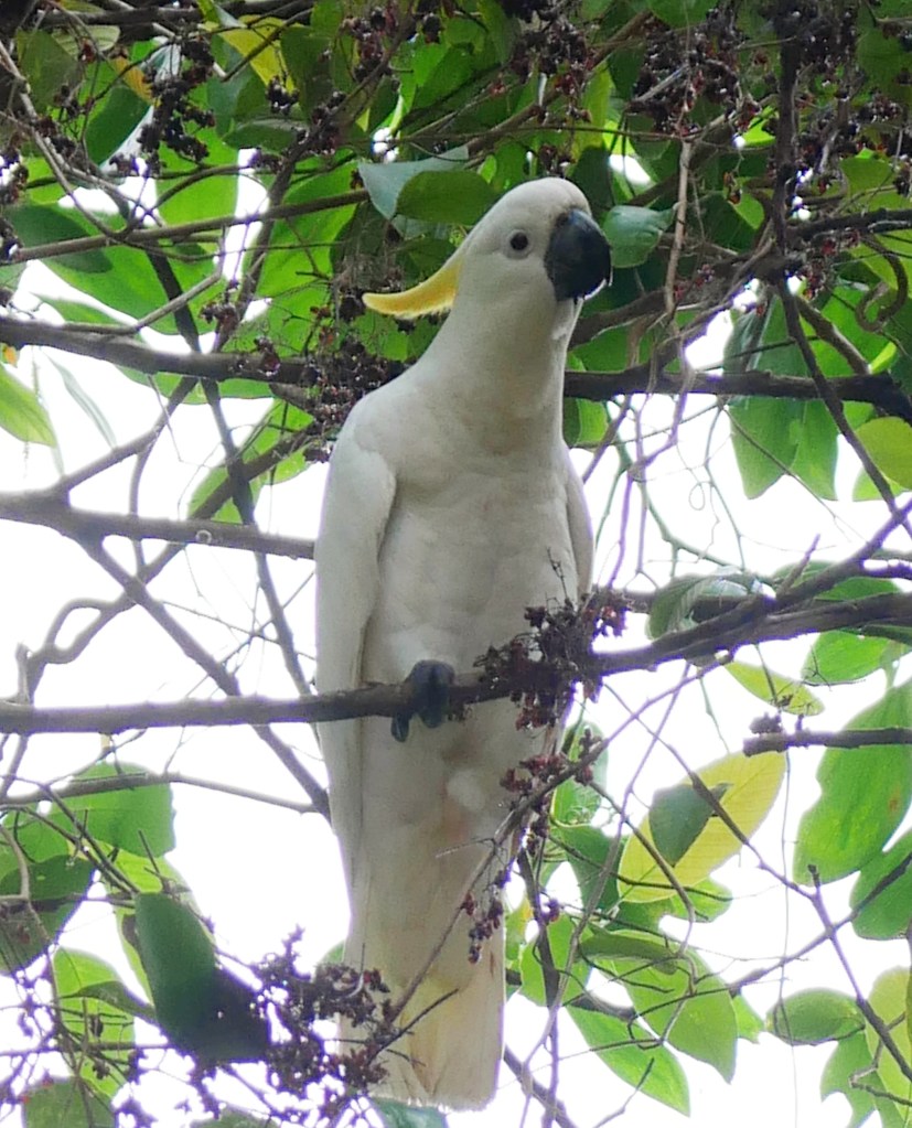 Comme il nous reste un tout petit peu de temps avant de devoir rejoindre l’aéroport, on repasse à Port Douglas pour aller boire quelque chose, grignoter rapidement un petit snack, voir la plage, et surtout revoir les nombreux cacatoès. Je découvre avec surprise qu’il y a beaucoup de monde dans le village et sur la plage ! Bien plus que lors de notre précédent passage. Des transats sont installés au bord de l’eau et les baigneurs sont nombreux (dans une zone surveillée bien délimitée et ils s’éloignent peu du bord), mais personnellement je n’aurais pas osé me baigner ici alors que l’eau est loin d’être transparente et qu’un panneau averti de la présence de crocodiles juste à l’entrée de la plage.