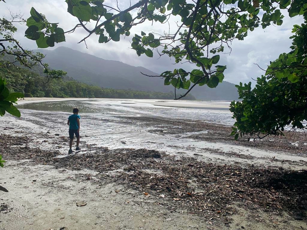 Le temps de poser nos affaires à l’hôtel (qui n’est pas aussi fantastique que sur les photos et manque clairement d’entretien…) et nous partons en exploration. Suivant le passage depuis l’aire de jeux du “village”, on accède à Myall Beach, la magnifique plage de Cap Tribulation. Bon, ce serait mieux avec du soleil, mais nous n’avons toujours pas beaucoup de chance côté météo.